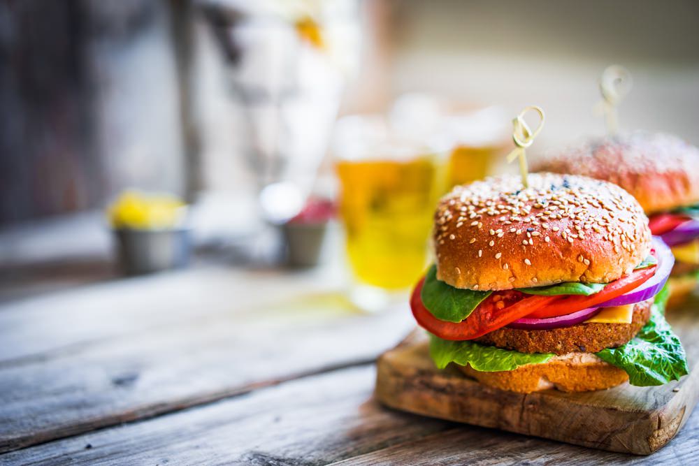 Geserveerd met sla, komkommer, tomaat, ui, cheddar kaas, onion rings en BBQ saus